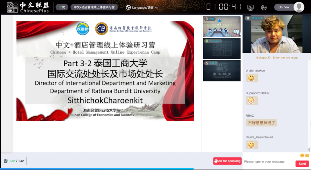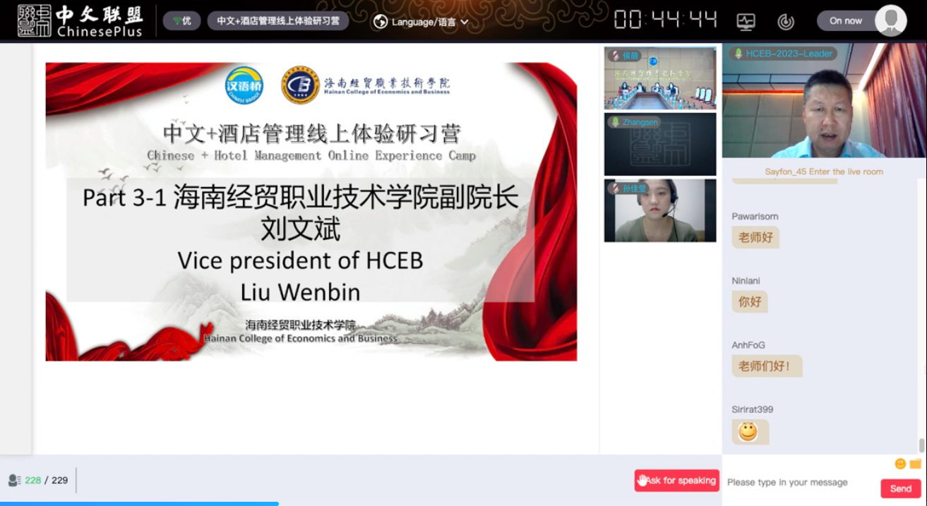 开营仪式后,学员们随即进入了国际旅游公司林文超副教授的课堂,一起了解酒店管理专业的情况,开启了为期13天的线上学习。