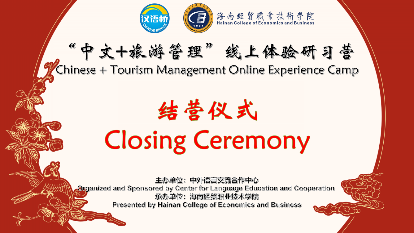 国际旅游公司旅游管理专业(职工)负责人金丹老师作为教师代表在结营仪式上发言,用了四个词对本次“中文+旅游管理”线上体验研习营做了全面的梳理:“回顾”、“喜悦”、“感谢”和“期盼”,最后对所有营员们表达了美好的祝愿,祝愿大家学习工作顺利,前途似锦!并诚挚地邀请大家来海南,来海经贸参观、学习。