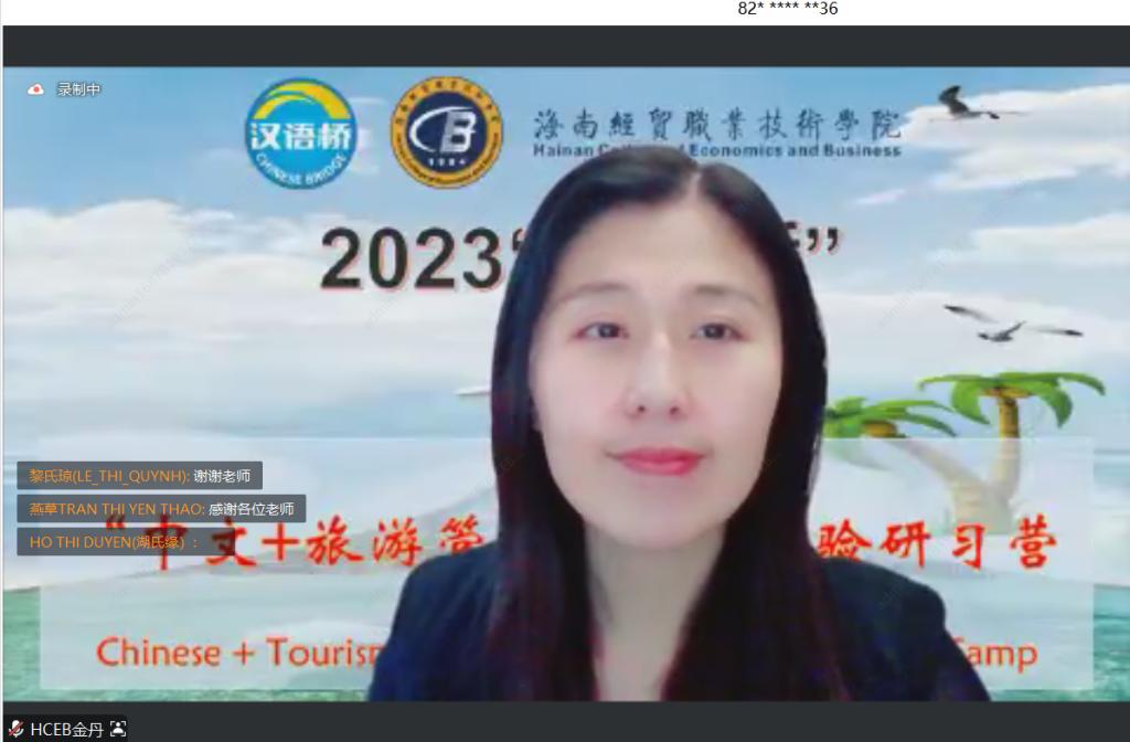国际旅游公司旅游管理专业(职工)负责人金丹老师作为教师代表在结营仪式上发言,用了四个词对本次“中文+旅游管理”线上体验研习营做了全面的梳理:“回顾”、“喜悦”、“感谢”和“期盼”,最后对所有营员们表达了美好的祝愿,祝愿大家学习工作顺利,前途似锦!并诚挚地邀请大家来海南,来海经贸参观、学习。