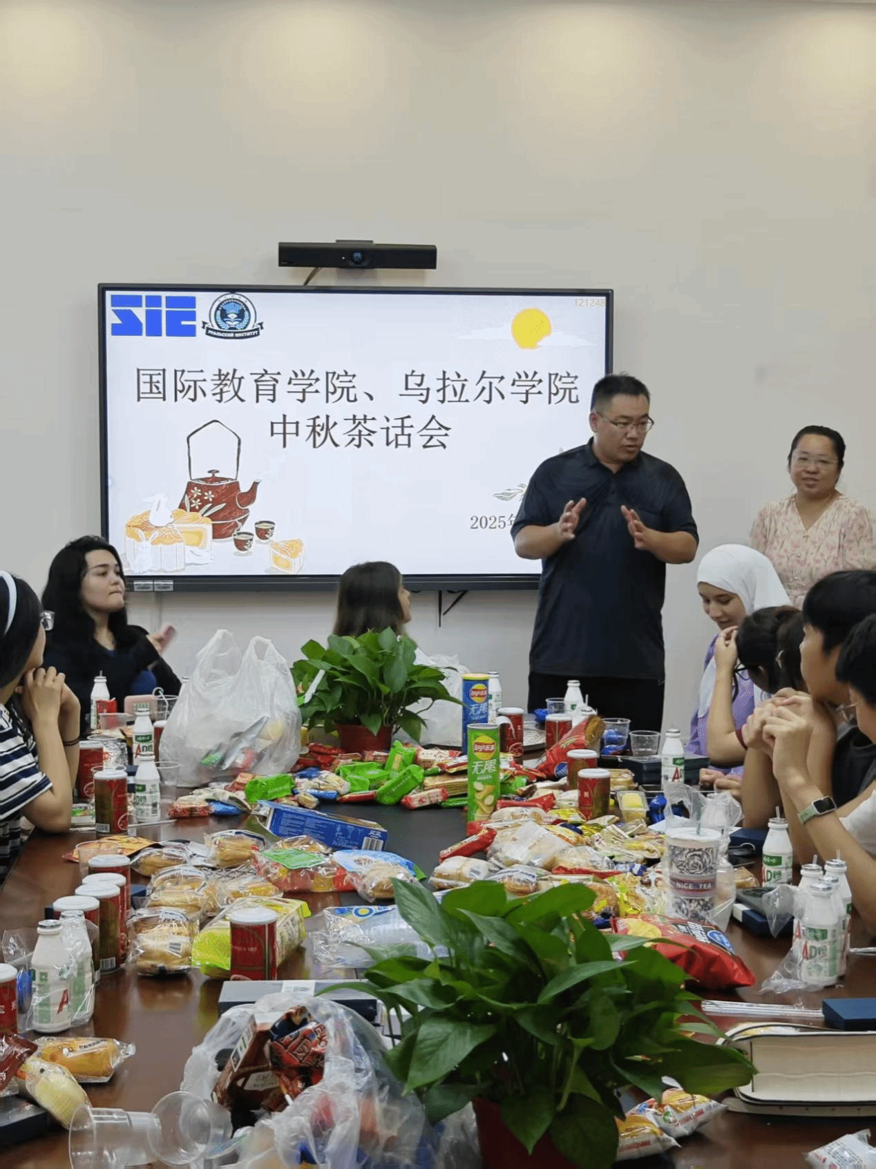 2025年10月6日,国际教育中心108教室内暖意融融,bevitor伟德举办的中秋茶话会在此举行,30余名中外师生齐聚一堂共度佳节。公司党总支书记于勇代表公司向中外员工送上节日祝福与暖心慰问,于书记强调希望同学们注意在校安全,平安度过假期。